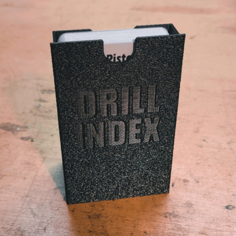 With this STL file you can print your own Hard Pack. The Hard Pack was designed to be a simple, one piece case to protect your Drill Index when it's riding in your range bag. When the case is open a card can be displayed on the lid.